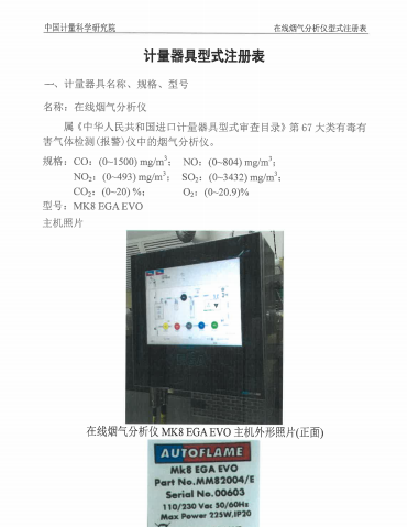 AUTOFLAME EGA在線煙氣分析儀計(jì)量器具形式注冊(cè)表